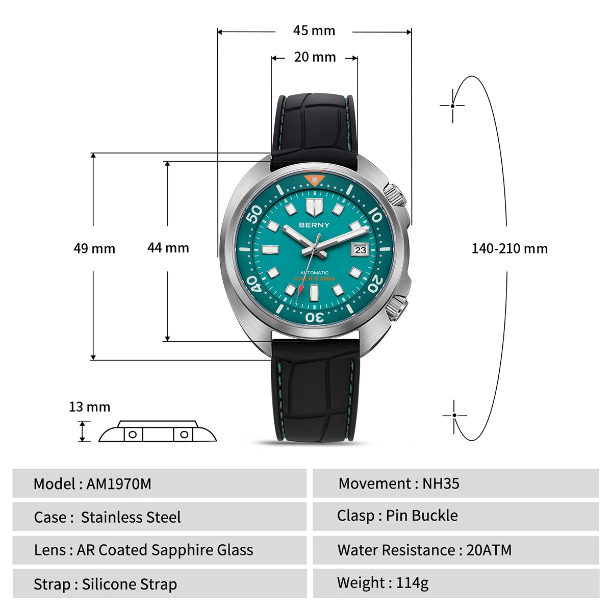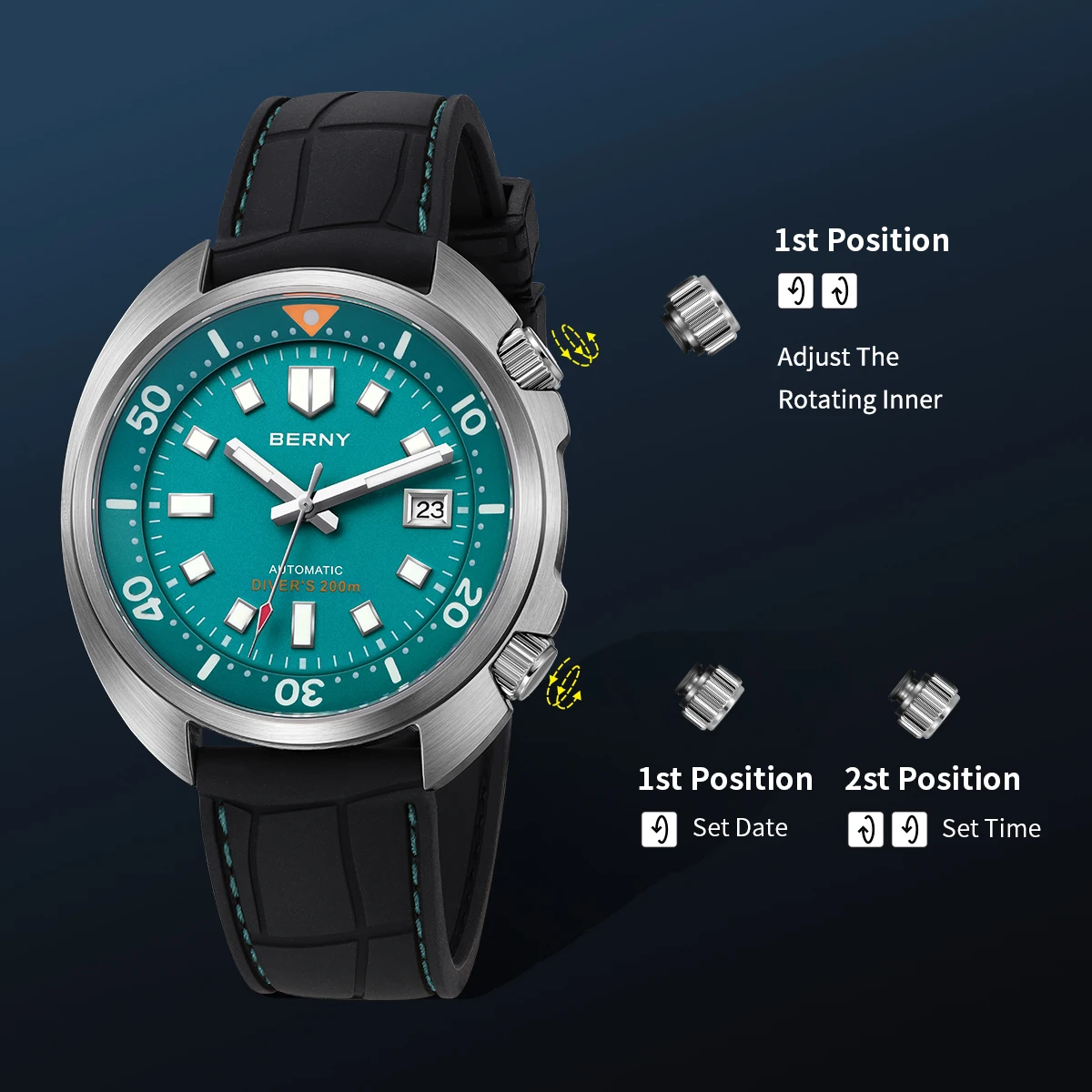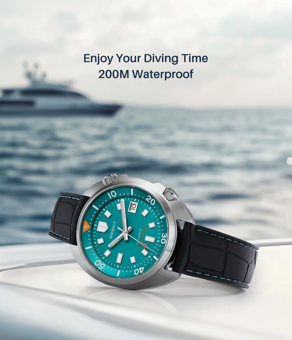 BERNY Watch 20ATM Diver For Men Mechanical Green Dial