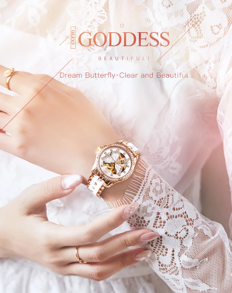 OLEVS Top Brand Mechanical Women Watch Fashion Switzerland Luxury Brand Ladies Wrist Watch Automatic Leather Strap Gift